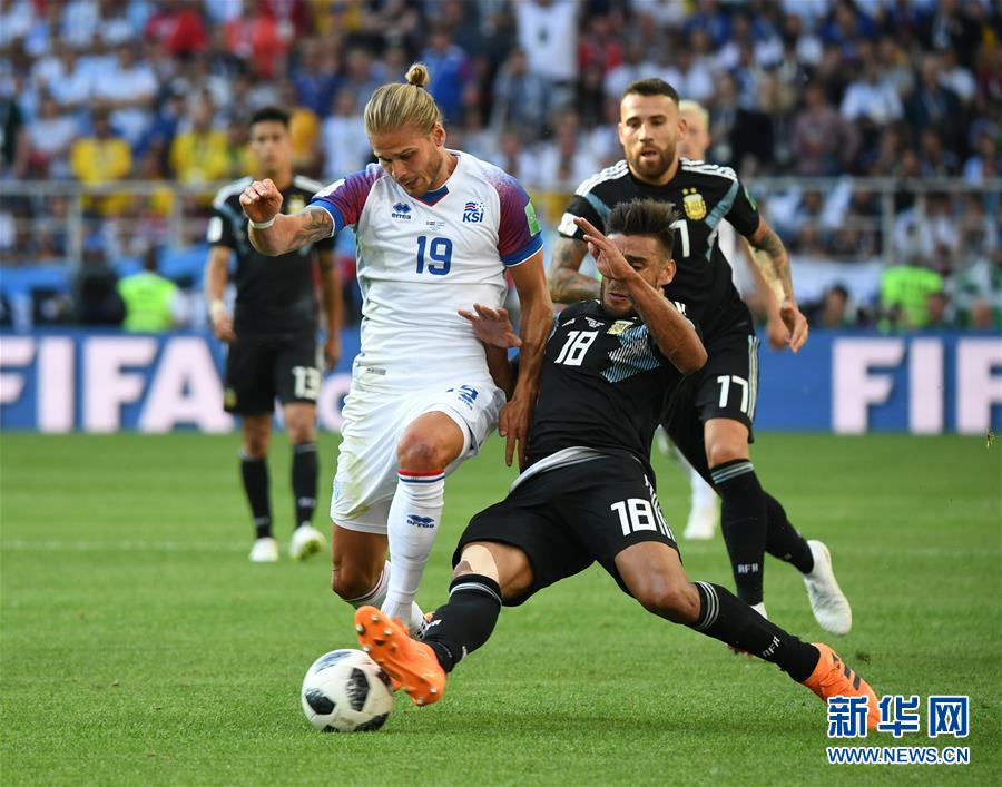 6月16日,冰岛队球员吉斯拉松(左)和阿根廷队球员萨尔维奥在比赛中拼抢。当日,在莫斯科进行的2018俄罗斯世界杯足球赛D组小组赛中,阿根廷队以1比1战平冰岛队。新华社记者 杜宇 摄