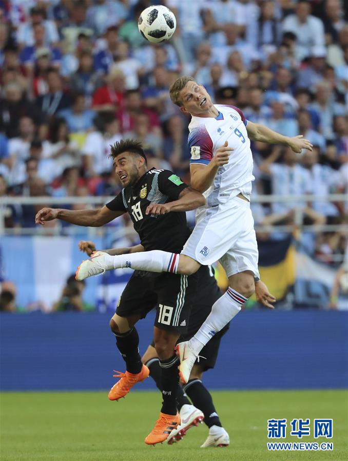 6月16日,阿根廷队球员萨尔维奥(左)在比赛中与冰岛队球员西古德森争顶。当日,在莫斯科进行的2018俄罗斯世界杯足球赛D组小组赛中,阿根廷队以1比1战平冰岛队。新华社记者 白雪骐 摄