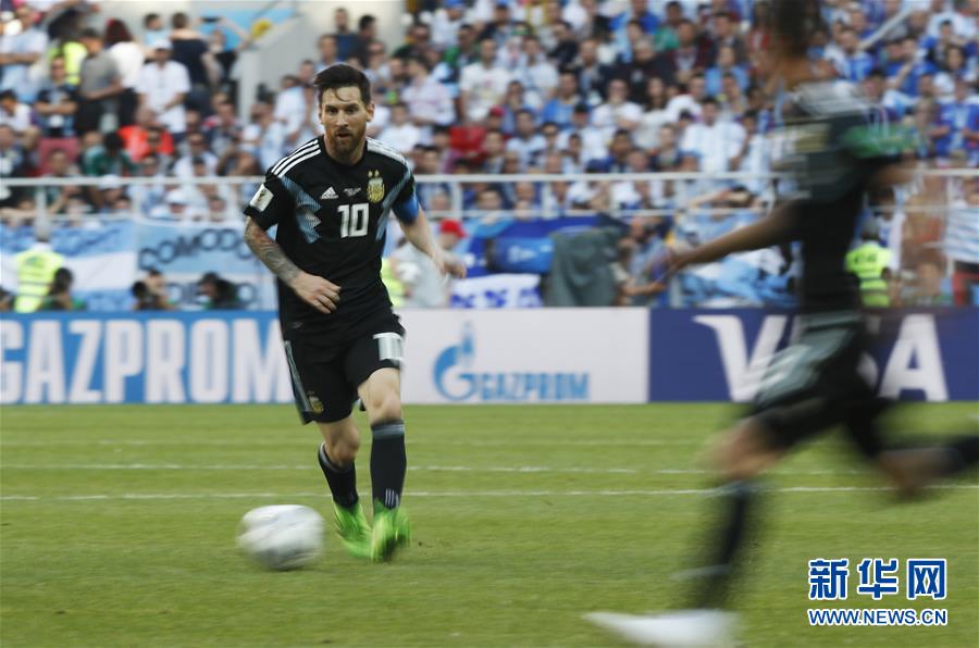 6月16日,阿根廷队球员梅西(左)在比赛中。当日,在莫斯科进行的2018俄罗斯世界杯足球赛D组小组赛中,阿根廷队以1比1战平冰岛队。新华社记者 曹灿 摄