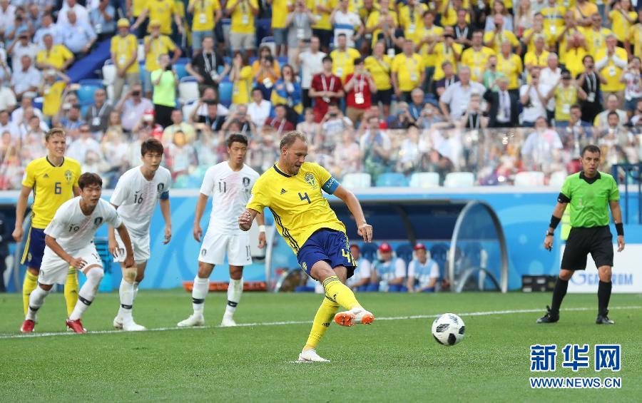 ↑6月18日,瑞典队球员格兰奎斯特(右二)主罚点球破门。新华社记者杨磊摄