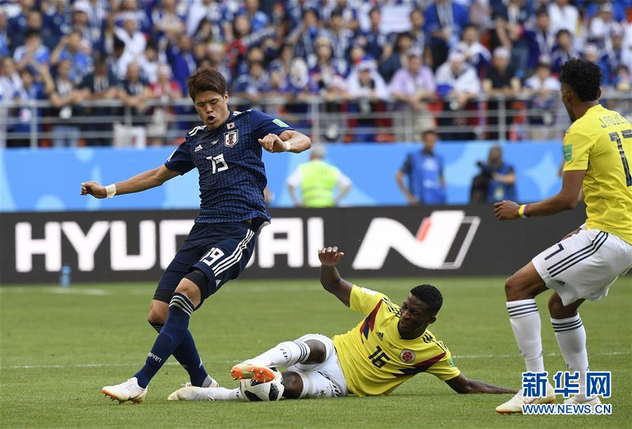 6月19日,哥伦比亚队球员莱尔马(中)与日本队球员酒井宏树(左)在比赛中争抢。 新华社记者吕小炜摄