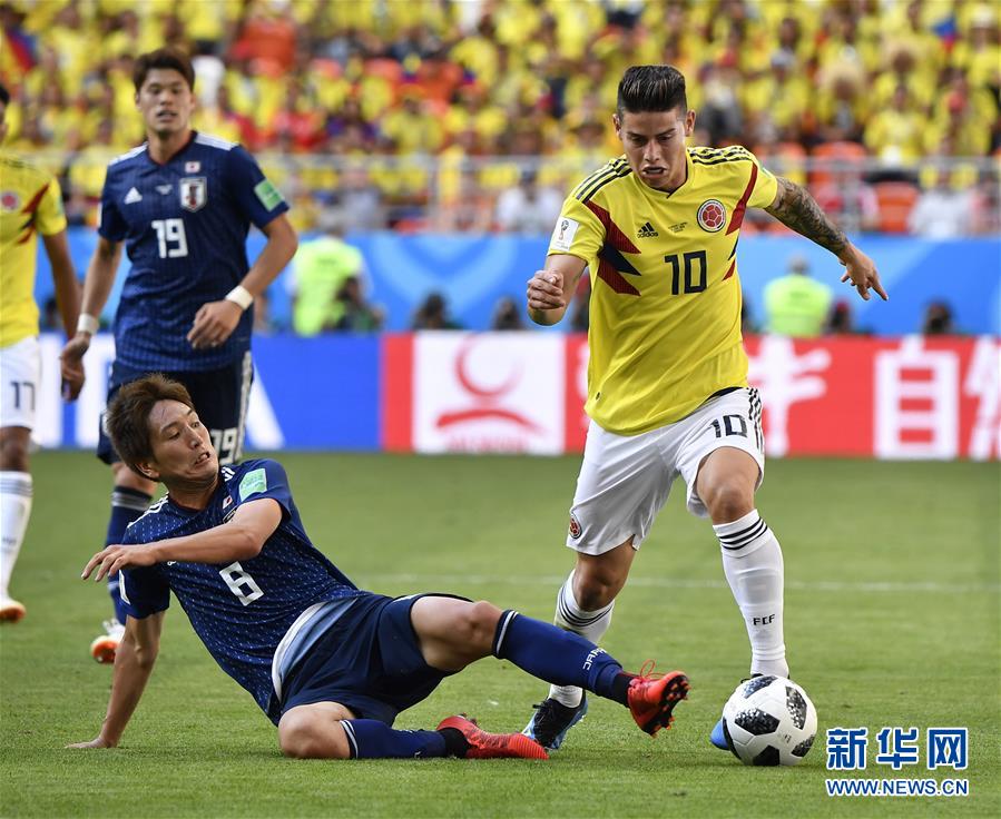 6月19日,哥伦比亚队球员哈·罗德里格斯(右)与日本队球员原口元气(下)在比赛中拼抢。 新华社记者贺灿铃摄
