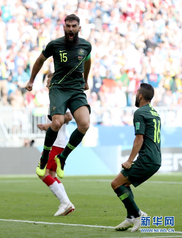 ↑6月21日,澳大利亚队球员米·耶迪纳克(上)在比赛中庆祝进球。当日,在萨马拉进行的2018俄罗斯世界杯足球赛C组小组赛中,澳大利亚队对阵丹麦队。新华社记者费茂华摄