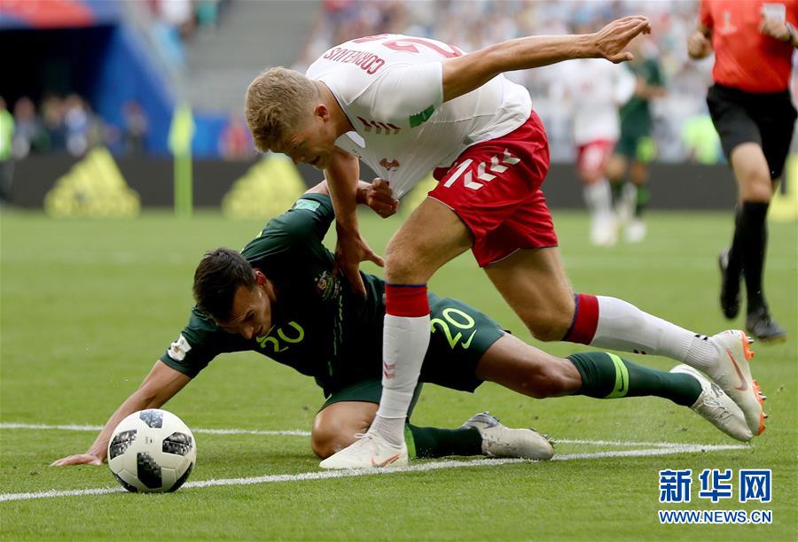 ↑6月21日,丹麦队球员安·科尔内留斯(上)与澳大利亚队球员塞恩斯伯里在比赛中拼抢。当日,在萨马拉进行的2018俄罗斯世界杯足球赛C组小组赛中,澳大利亚队对阵丹麦队。新华社记者费茂华摄