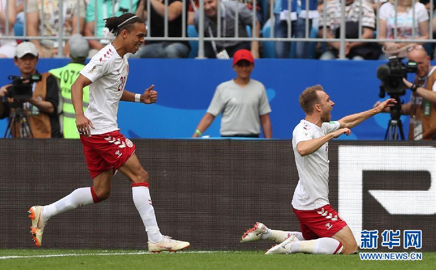↑6月21日,丹麦队球员埃里克森(右)庆祝进球。当日,在萨马拉进行的2018俄罗斯世界杯足球赛C组小组赛中,丹麦队对阵澳大利亚队。新华社记者费茂华摄