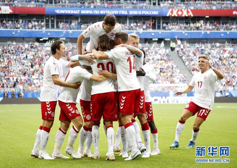 ↑6月21日,丹麦队球员庆祝埃里克森进球。当日,在萨马拉进行的2018俄罗斯世界杯足球赛C组小组赛中,丹麦队对阵澳大利亚队。新华社记者费茂华摄