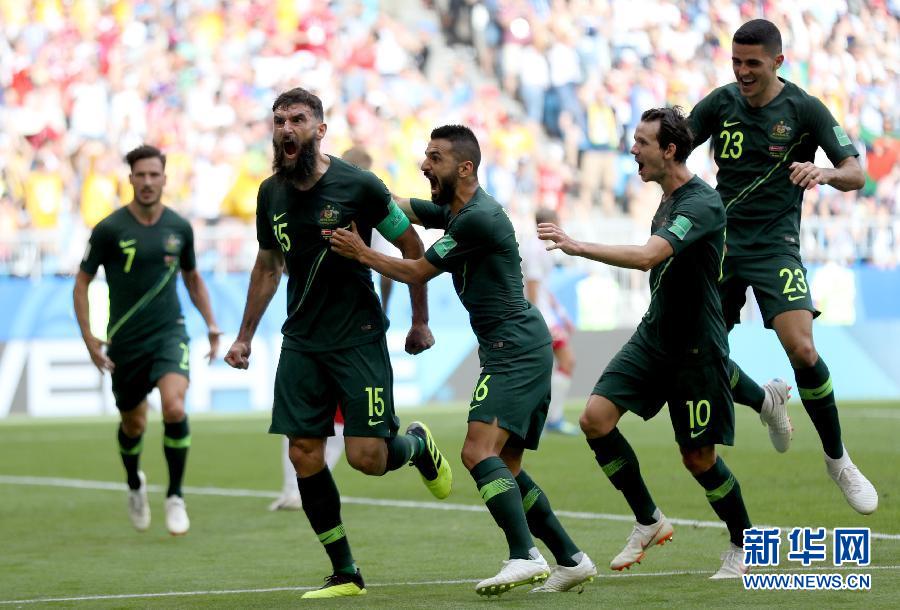 ↑6月21日,澳大利亚队球员米·耶迪纳克(左二)点球破门后与队友庆祝。当日,在萨马拉进行的2018俄罗斯世界杯足球赛C组小组赛中,澳大利亚队对阵丹麦队。新华社记者费茂华摄
