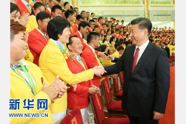 2016年8月25日,习近平在北京人民大会堂会见第31届奥林匹克运动会中国体育代表团全体成员。(图片来源:新华社)