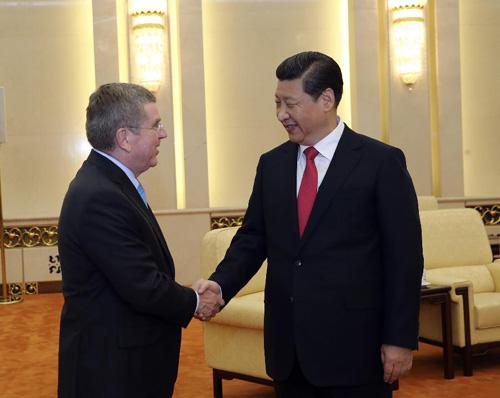 2013年11月19日,习近平在人民大会堂会见国际奥委会主席巴赫并接受奥林匹克金质勋章。(图片来源:新华社)