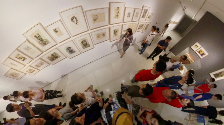 罗中立先生《父亲》手稿展。之前画了三稿。从《守粪农民》到《粒粒皆辛苦》,再到《生产队长》,罗中立感激那些苦苦地支撑着这个国家,饱经生活风雨后坚守做人本分的父辈,对他们有深沉的爱与敬意。图为工作人员讲解手稿展品,揭秘创作心路。