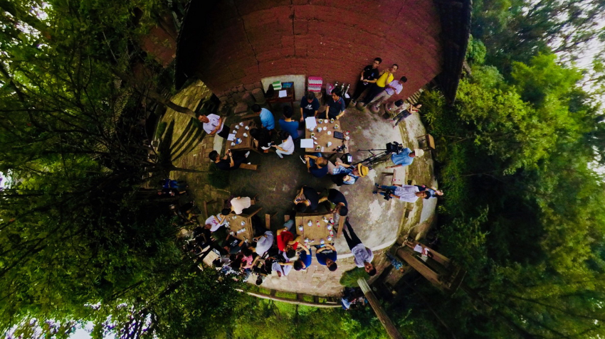 仲夏时节,清风习习送凉爽。图为学者与记者朋友在川美别致的农家小园,品茗畅谈“一带一路”。
