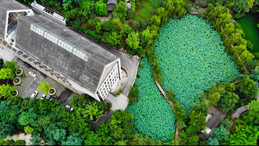 川美的翠绿随处可见。图为心形的荷塘,龙形的桥。