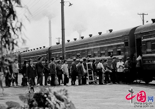 1978年,哈尔滨三棵树站,乘客们排队检票上车。王福春摄影