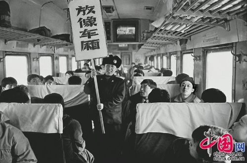 1989年,牡丹江——长汀。列车员高举“放像车厢”走过。“放像车厢”,即电视车厢。这当时为满足部分乘客需要开设的服务。王福春摄影