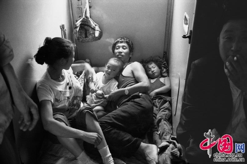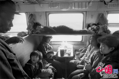 1991年,上海——重庆。挤在过道一个狭小空间里的一家四口。王福春摄影