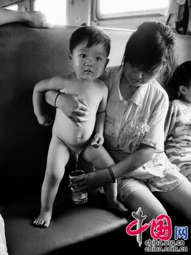 1992年,南宁——北京。年轻的妈妈想出了用八宝粥的铁罐来当作“临时厕所”,以解决儿子的内急。王福春摄影