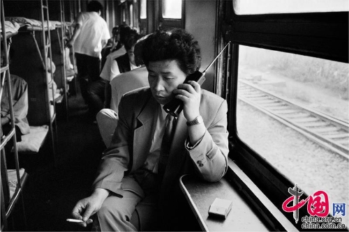 1994年,沈阳——大连。改革开放后做生意的乘客在卧铺车厢拿着当时最时髦的大哥大联系生意。王福春摄影
