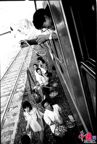1995年,兰州——西宁。停车后一拥而上的小商贩,他们提着竹篮往车窗里递东西。王福春摄影