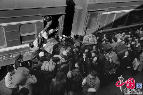 1994年,哈尔滨站。蜂拥上车的旅客们扛着大包小包挤向狭小火车门。王福春摄影