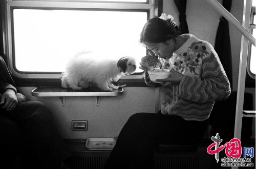 1995年,齐齐哈尔——北京。在宠物狗旁吃方便面的女青年。王福春摄影