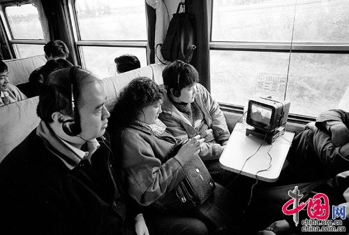 1998年,哈尔滨——牡丹江。人们把有天线的小电视带上火车看节目。王福春摄影