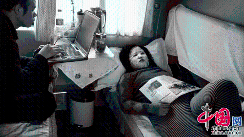 2007年,北京到拉萨的列车上,一位女子躺着做面膜,另一位男人则在玩电脑。王福春摄影