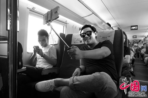 2014年,重庆——北京高铁。一位男士使用便携支架看手机。王福春摄影
