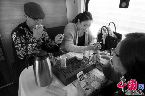 2014年,广州南——北京西高铁。乘客喝茶聊天玩手机。王福春摄影