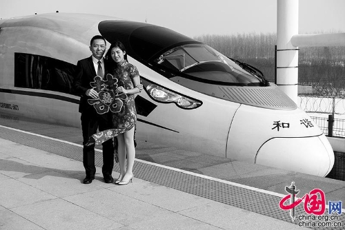 2015年,北京南——抗州(德州)。一对新人拿着喜字与和谐号合影。王福春摄影