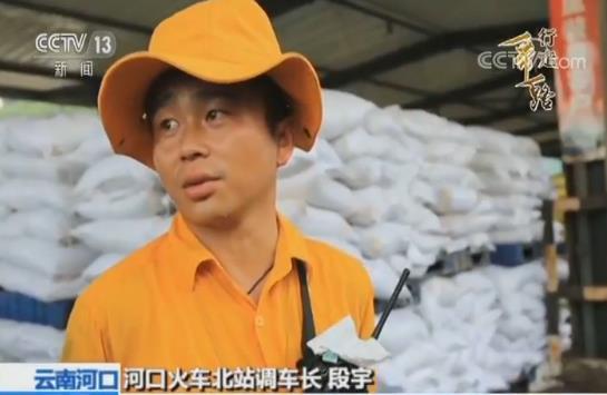 河口火车北站 调车长 段宇:“以前车站没建的时候一般都是靠汽车运输,运费这些方面都比较高。现在我们国家不是开启‘一带一路’把火车站建起来,进出口的货物用我们火车运输方便、快捷、安全,然后运费也不算太高,低碳环保 我们现在用电不烧油。”