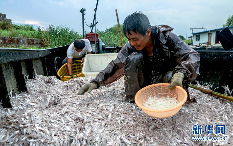8月16日,庐江县盛桥镇沿湖渔民在分拣从巢湖里捕捞上岸的毛鱼、银鱼等水产品。新华社发(左学长摄)