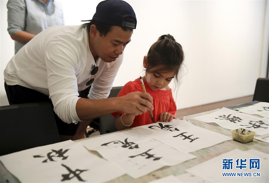 9月22日,在美国纽约华人博物馆,一名儿童学写中国书法。当日,纽约华人博物馆举行中秋节文化体验活动,孩子们学习中国书法、听中秋故事、制作皮影玩偶和月饼,体验中国传统文化。新华社记者王迎摄