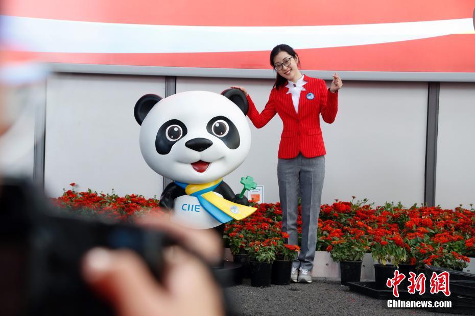 志愿者与进博会吉祥物“进宝”合影留念。汤彦俊摄