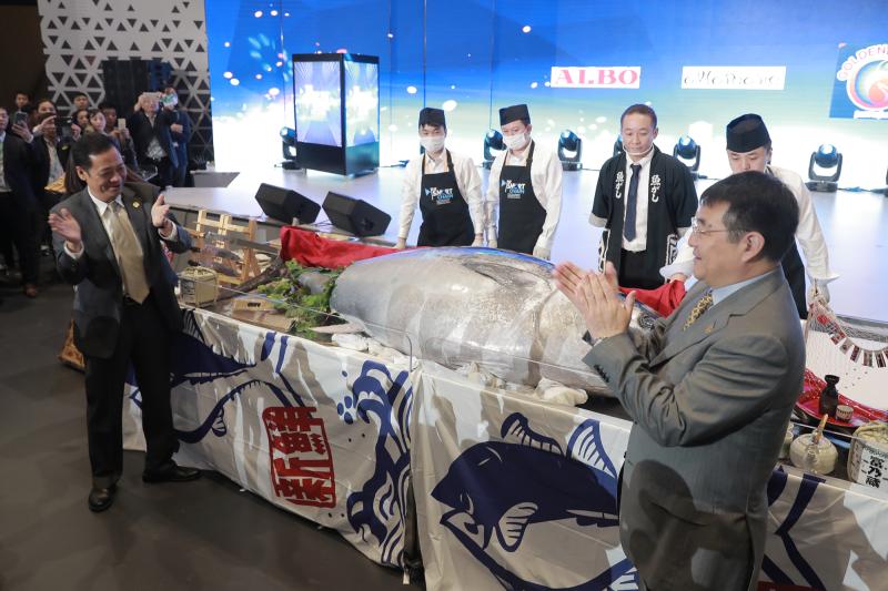 当“红盖头”被揭开时,一条将近2米长、重达250公斤巨型蓝鳍金枪鱼露出真容,迅速引起了现场一片喝彩声。在日本金枪鱼的开鱼世家内田先生的刀下,“三下五除二”,不到半个小时,这条“飞奔而来”的金枪鱼就在他的无敌刀工下,被一块块分好亮相光明食品的水产展台,现场数百位专业观众不但见证这场视觉盛宴,还有幸品鉴到了鲜美的金枪鱼刺身,堪称一次视觉和味蕾双重体验。