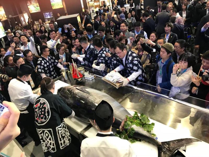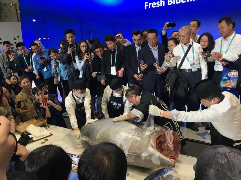跨越一万公里旅程,耗时仅仅90个小时,远渡重洋而来的蓝鳍金枪鱼准时亮相进博会食品与农产品展馆。
