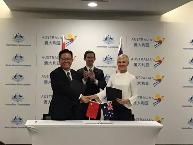 苏宁零售集团副总裁王哲(左),与澳大利亚贸易委员会全球首席执行官Stephanie Fahey博士,共同签署合作协议。