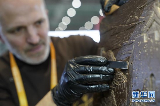 在进博会食品及农产品展区,来自俄罗斯的巧克力雕塑家维塔利·波诺马廖夫在制作中国长城主题的巧克力雕塑作品。(新华社记者 沈伯韩 摄)