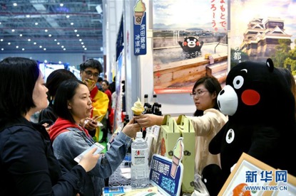 观众在日本滨田酱油株式会社展台品尝酱油冰淇淋。 (新华社记者 李鑫 摄)