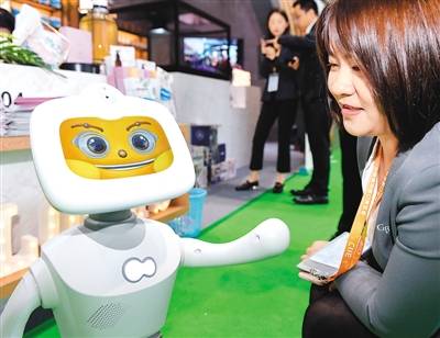 进博会上的Robelf小贝机器人同工作人员交流互动。 新华社记者 李 贺摄