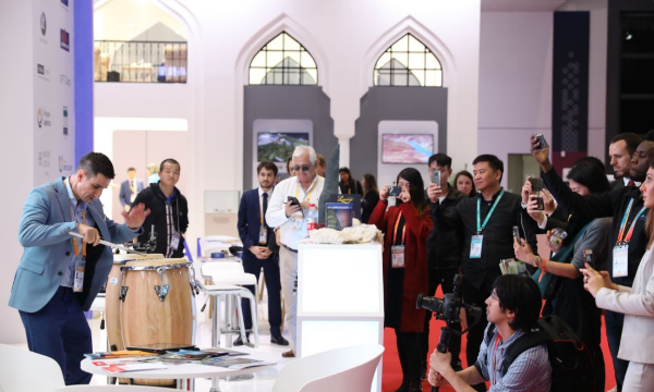 ▲乌拉圭展位鼓声不断。工人日报记者 吴凡 摄