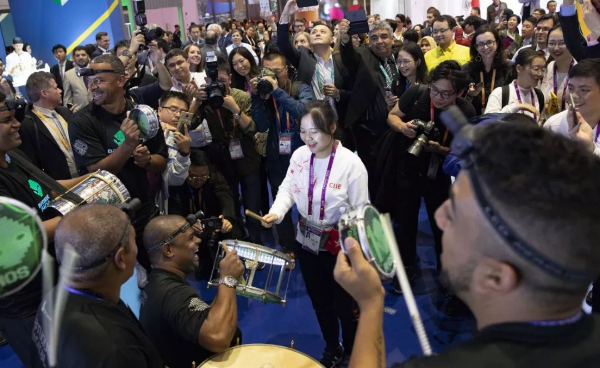 ▲巴西展位展开音乐狂欢活动,吸引了众多参观者。工人日报记者 吴凡 摄
