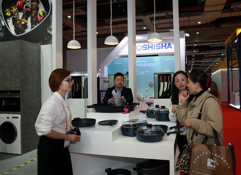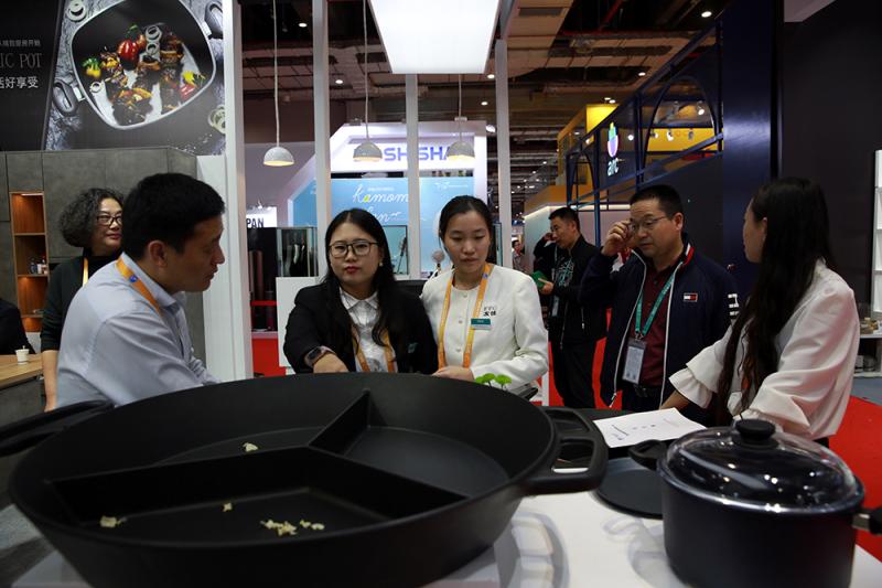 6.1馆SKK锅具展台,一口造型精致的手铸不粘锅不间断煎烤土豆和香肠等食物,因其导热均匀,干烧不坏,烹制食物可以不加油或者少加油,食材最大限度保持了原味。