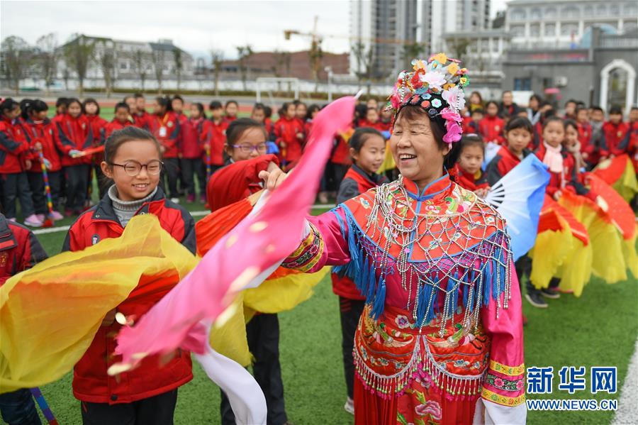 12月27日,在贵州省余庆县城关一小,民间艺人在教学生们跳花灯动作。当日,贵州省遵义市余庆县组织民间文艺队走进城关一小,为师生们带来精彩的跳花灯、打钱杆等非遗表演,并与学生们互动,让学生们近距离感受传统文化的魅力。新华社发(贺春雨摄)