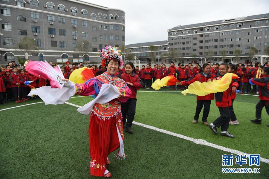 12月27日,在贵州省余庆县城关一小,民间艺人在教学生们跳花灯动作。当日,贵州省遵义市余庆县组织民间文艺队走进城关一小,为师生们带来精彩的跳花灯、打钱杆等非遗表演,并与学生们互动,让学生们近距离感受传统文化的魅力。新华社发(贺春雨摄)