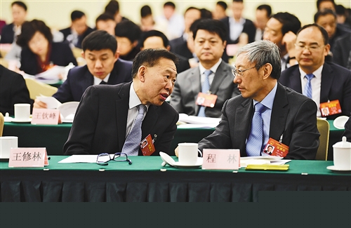 3月10日,人大山东代表团举行全体会议。全国人大代表王修林与同团代表程林就科研经费“包干制”等话题交流。经济日报-中国经济网记者李景录摄