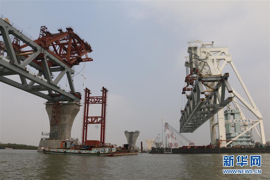 2月20日,在孟加拉国帕德玛大桥项目工地,中国建造的万吨级中心架梁起重船“天一号”准备将总重超过3000吨的钢梁架设到桥墩上。新华社发 段永红 摄