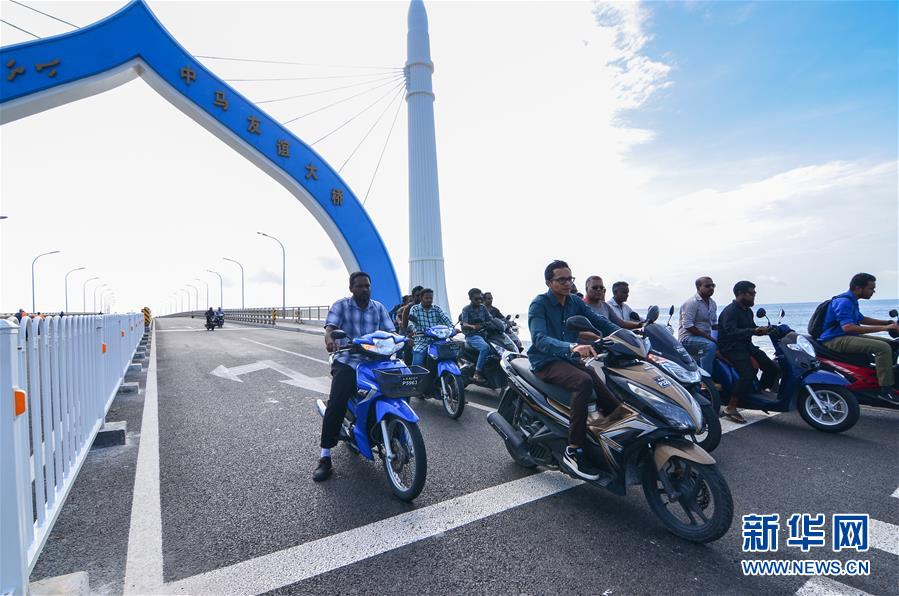 在连接马尔代夫首都马累和机场岛的中马友谊大桥上,当地居民在桥头等待通行(2018年10月8日摄)。新华社发 杜才良 摄