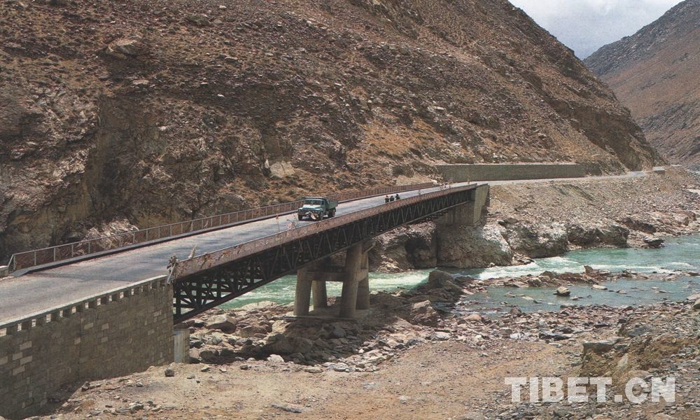 图为1991年修建的妥峡大桥。这是西藏自行设计、自行施工的第一座装配式吊桥,当时全国还没有先例,是西藏公路桥梁建设史上的创举。