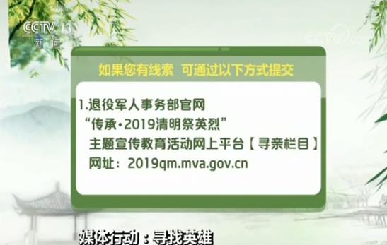 1.退役军人事务部官网“传承•2019清明祭英烈”主题宣传教育活动网上平台【寻亲栏目】(网址:2019qm.mva.gov.cn)提交;