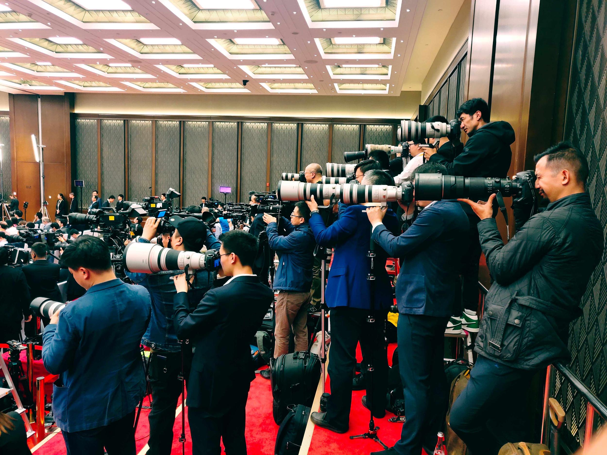 △记者会现场的各国摄影记者。(央视记者李晓周拍摄)